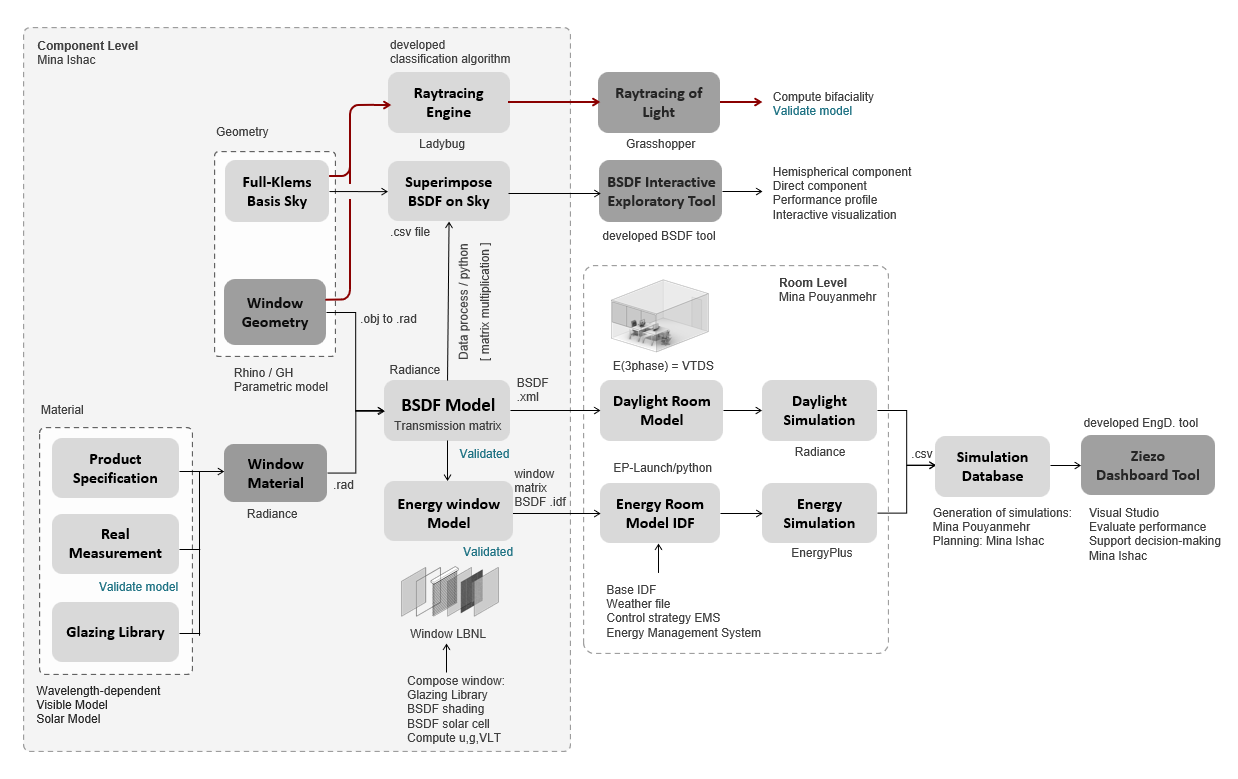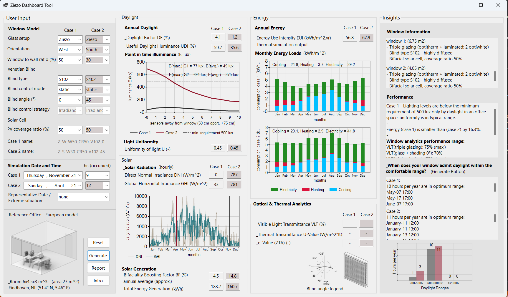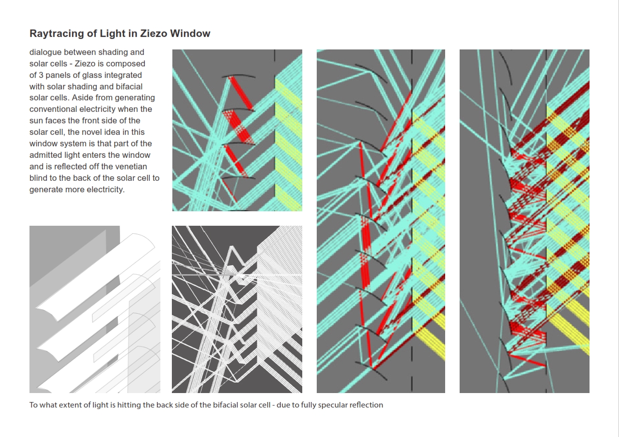 Ziezo is an insulated glazing unit, that integrates bifacial photovoltaic solar cells with solar shading. It is a window system that integrates solar shading with bifacial photovoltaic cells within the glazing unit. Ziezo concept was previously conceived by a consortium of partners: TNO, Pilkington, Eindhoven University of Technology, and W/E Adviseurs. As a proof of concept, Ziezo has been translated and manufactured to two prototypes: 1) smaller size of 46.5×40 cm at the research facility of SolarBEAT at Eindhoven University of Technology, and 2) real-scale sizes that were installed at the headquarter office of Pilkington at Enschede. The prototypes were installed in the two Dutch cities of Eindhoven and Enschede to begin testing their electrical performance. The key challenge of Ziezo in this project was that these prototypes have been designed as a concept based on rules-of-thumb, and developed yet without modeling for its performance. The project is supported by Topsector Energy of the Dutch Ministry of Economic Affairs. The work which was presented in Daylight Academy conference at Trondheim in 2024, and Sustainability Day exposition at TU Eindhoven.